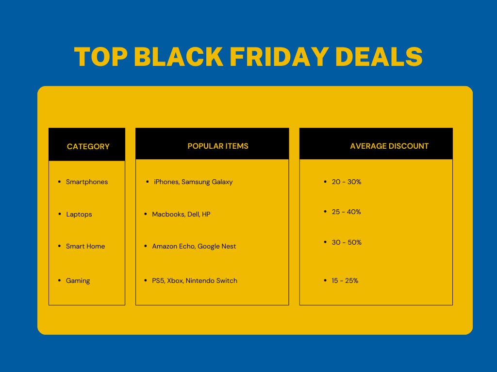 Black Friday is the perfect time to snag incredible deals on the latest electronics and gadgets. From smartphones to laptops, smart home devices to gaming consoles, retailers offer substantial discounts on popular items. Here's a quick overview of some of the best deals you can expect: